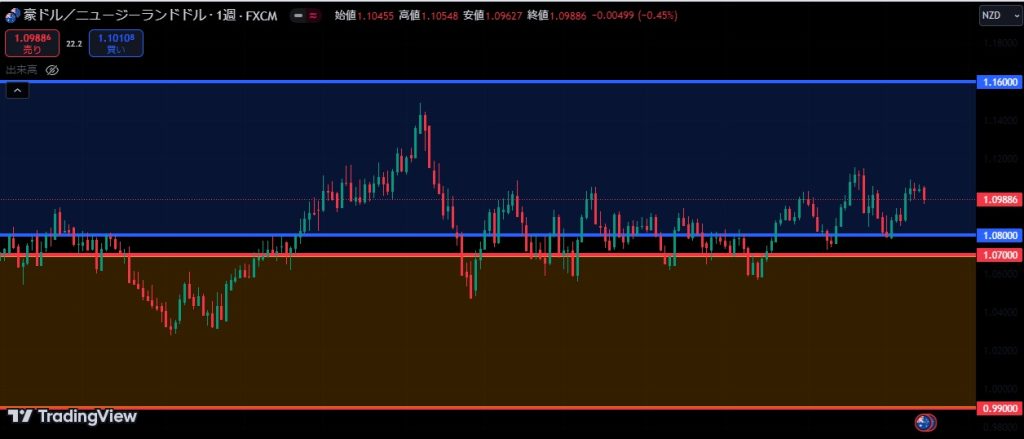 AUDNZDの週足です。青のゾーンは、EAの売りゾーンです。
