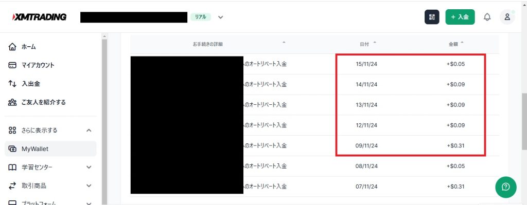 上記画像の赤枠部分が今週です。計0.63ドル(約95円)でした。