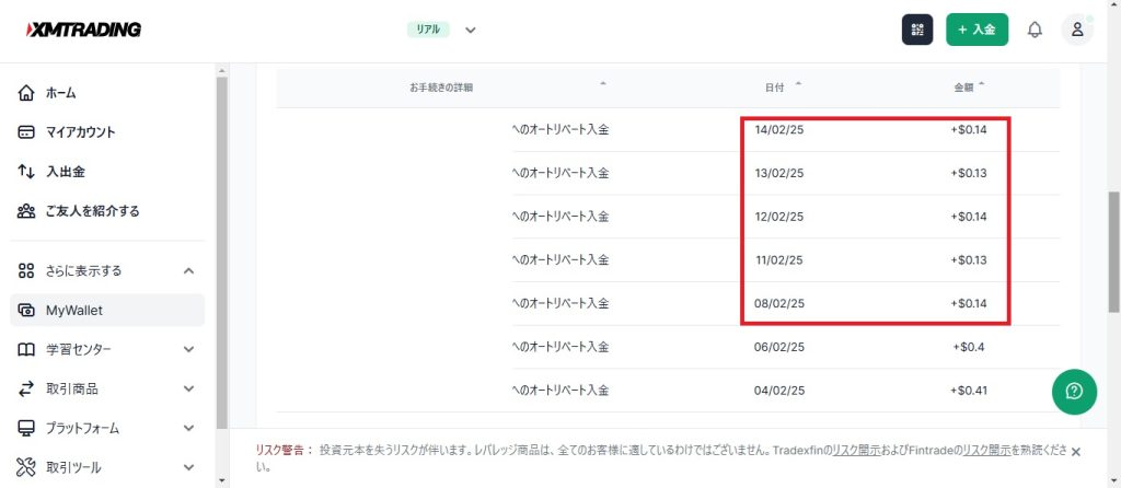 上記画像の赤枠部分が今週です。計0.68ドル(約103円)でした。