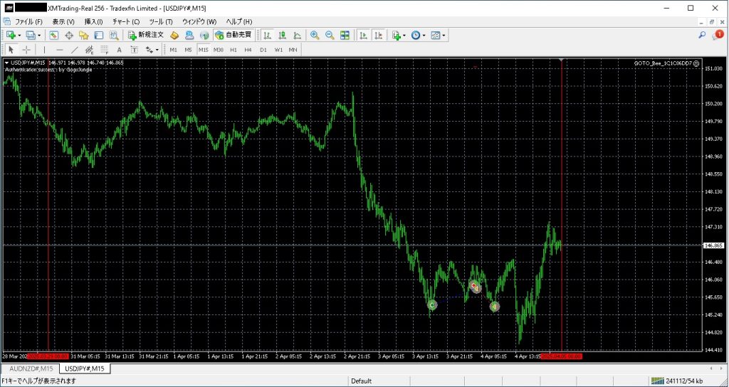 上記は、USDJPYのチャートです。今回から新たなEA「GOTO-Bee」を追加しました。