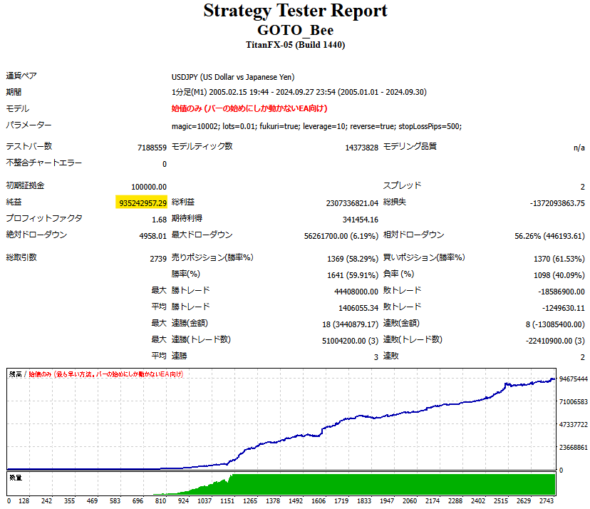 10万円スタートが9億円にまでなっています。実運用では、最大ロット制限がかかるので、このとおりにはなりませんが、仲値トレードにはそれなりに優位性があり、そこそこ期待できます。