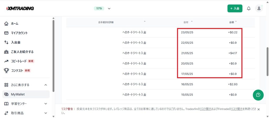 5月4週目は、7.09ドル(約1,006円)のキャッシュバックがありました。