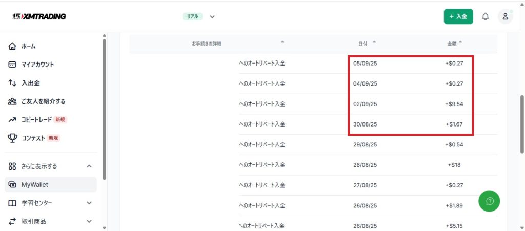 9月1週目は、11.75ドル(約1,727円)のキャッシュバックがありました。