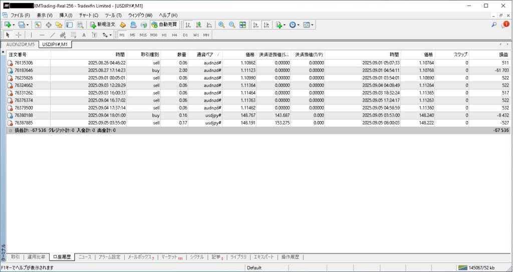「激勝ちAUDNZD」は、7ポジションが決済され、58,577円のマイナスとなっています。