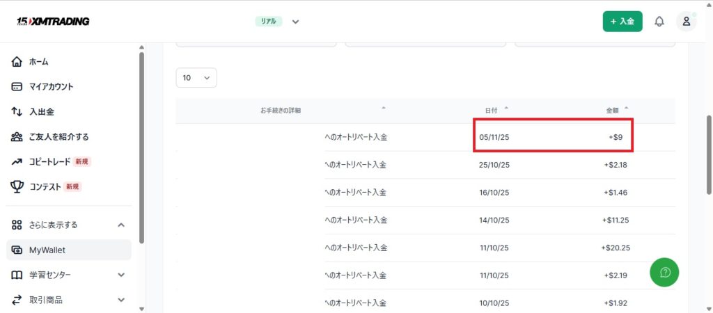 11月1週目は、9ドル(約1,377円)のキャッシュバックがありました。