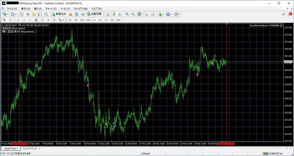 こちらが、「ラウンドナンバーブレイク手法」EAのチャートです。5回トレードしてました。